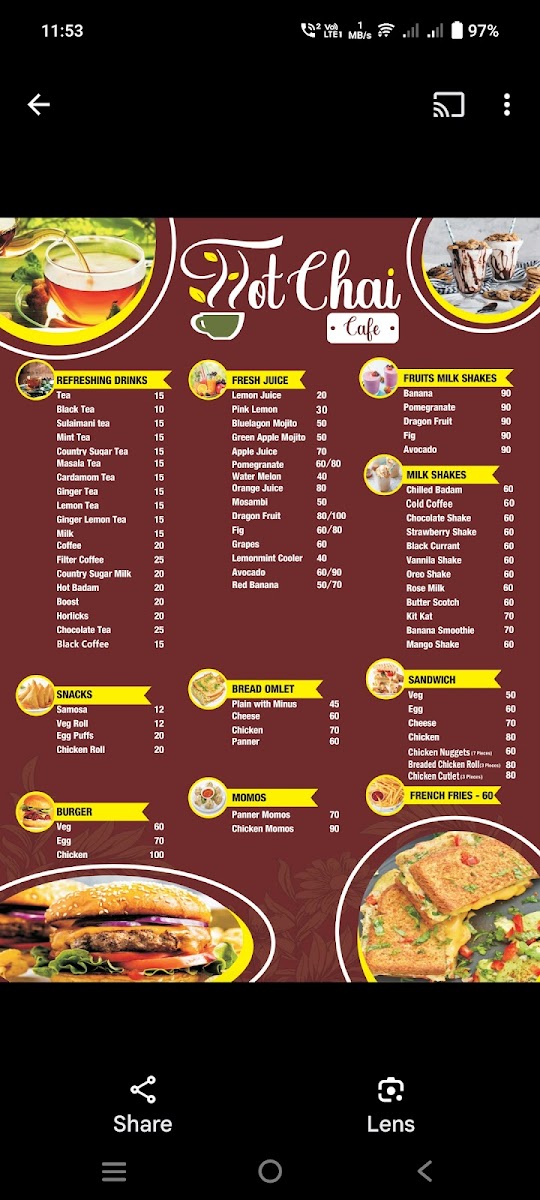 Welcome to HOT chai cafe, a charming spot nestled on Auroville Road in Tamil Nadu. This cafe is a delightful haven for chai enthusiasts and food lovers alike. With a menu brimming with delicious options, patrons can savor a variety of burgers starting at ₹60, scrumptious sandwiches ranging from ₹50 to ₹80, and refreshing fruit milkshakes priced at ₹90.